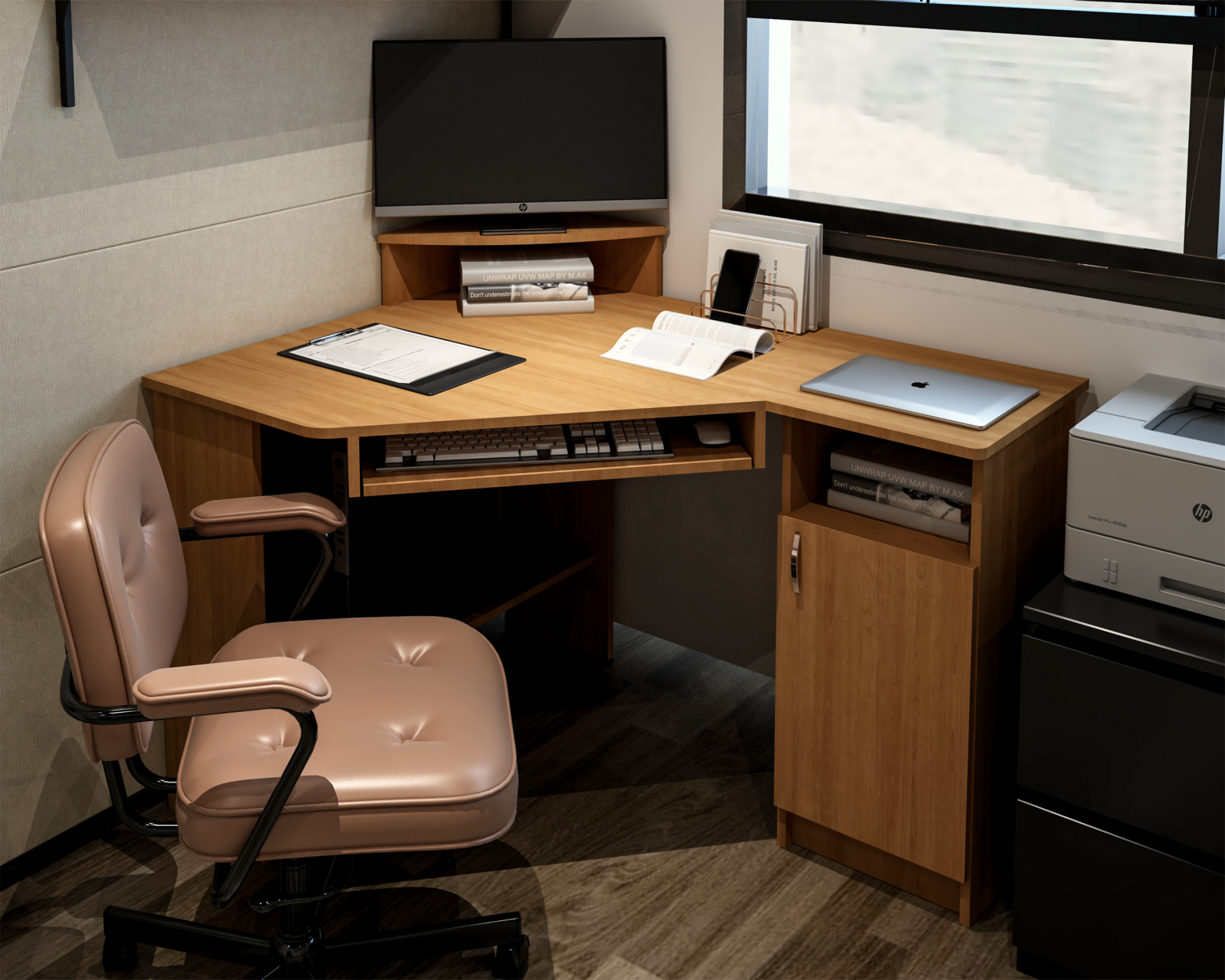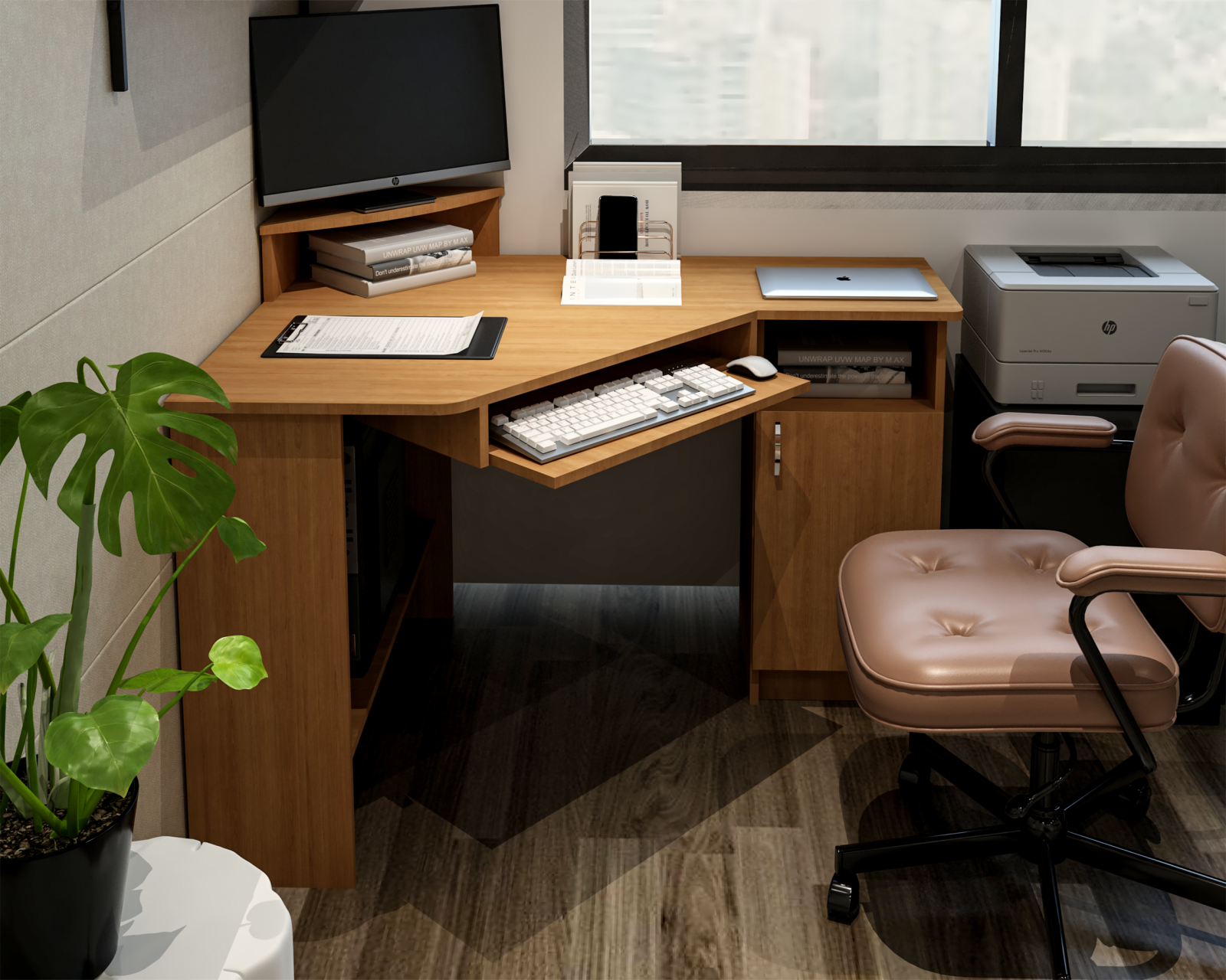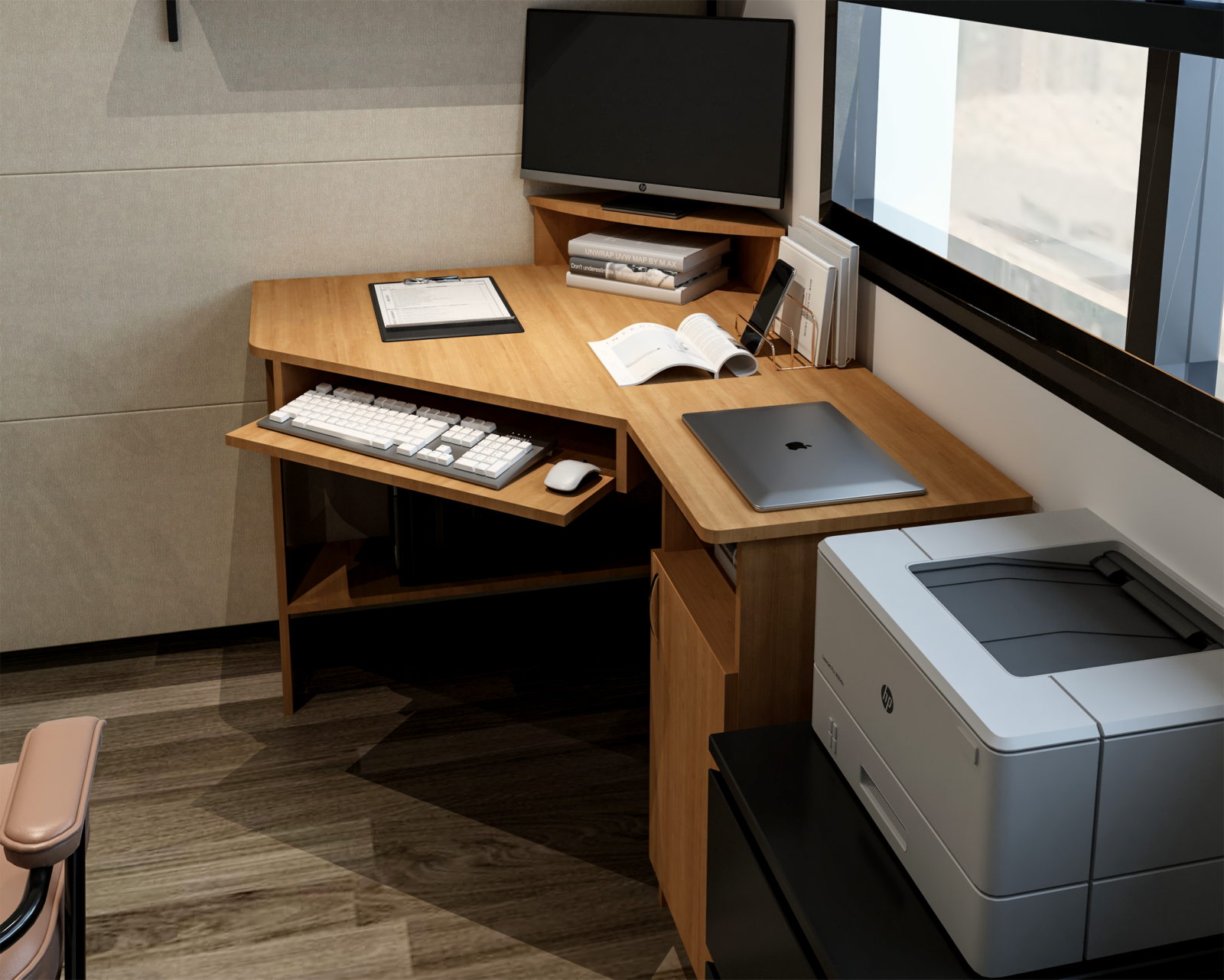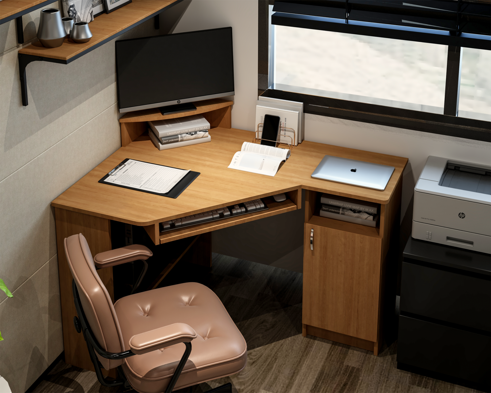 Biroul SU 13 este un birou pe colt, prevazut pe latura din stanga ( lungime =90cm ) cu suport glisant pentru tastatura si un raft depozitare in partea inferioara. Latura din partea dreapta ( lungime 120cm ), este prevazuta cu 1 corp cu 3 rafturi si 1 usa.
