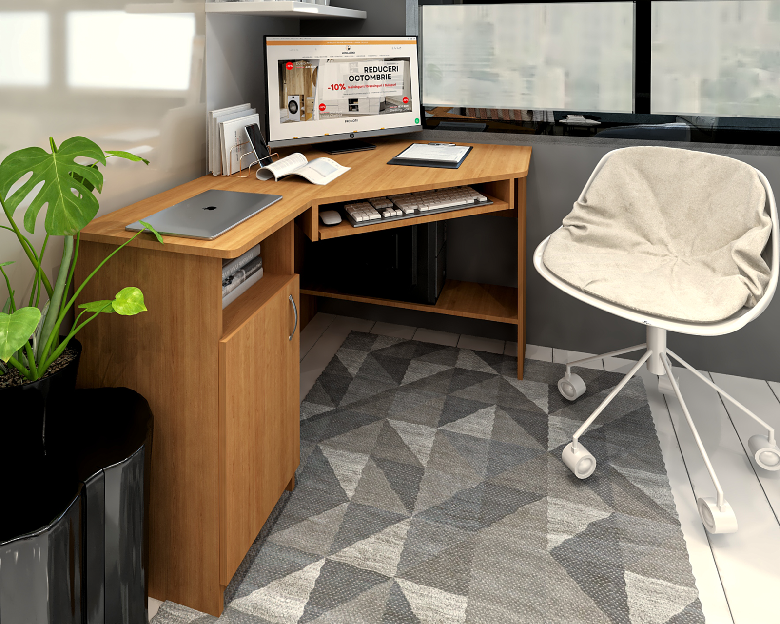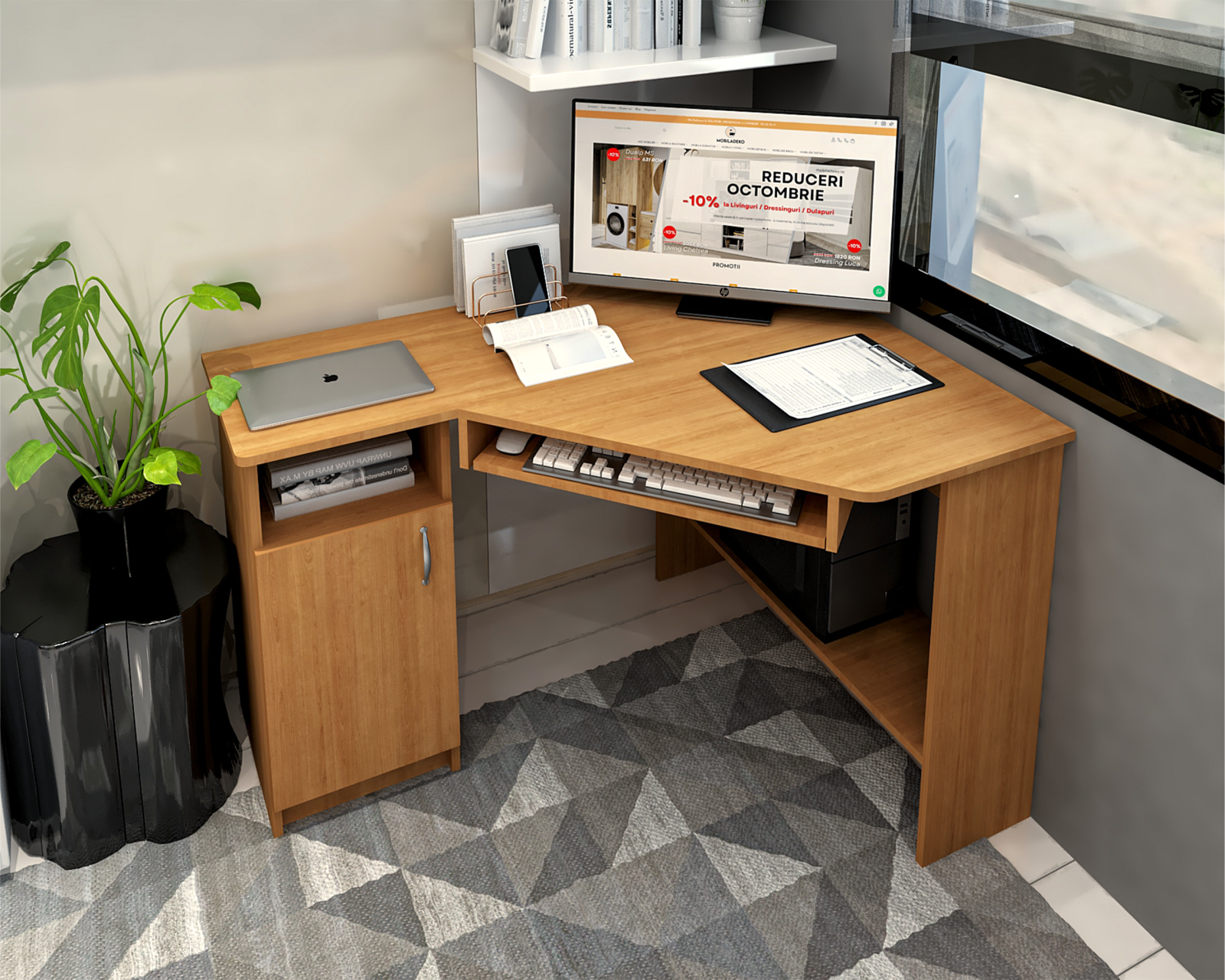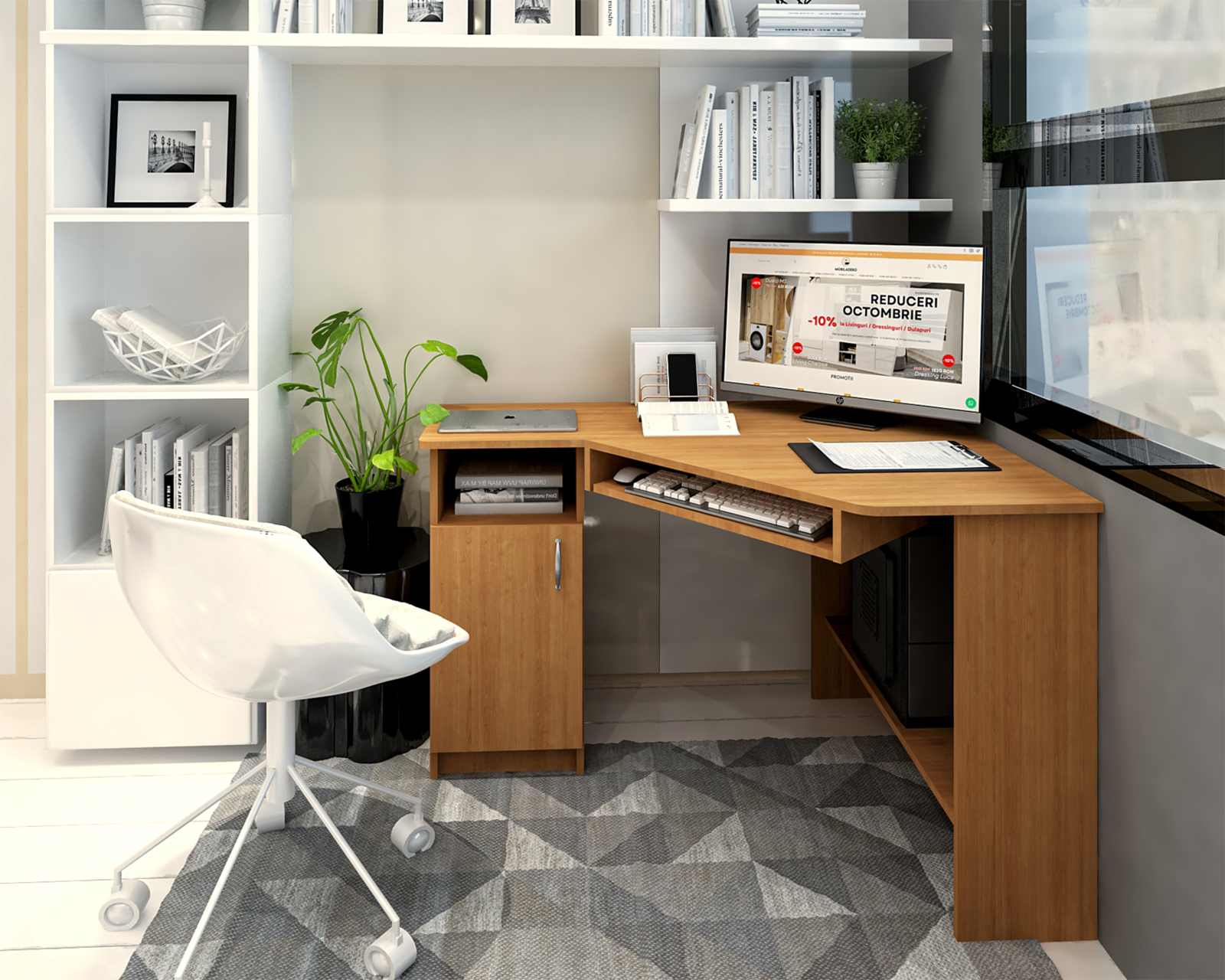 Biroul SU 14 este un birou pe colt, prevazut pe latura din stanga ( lungime =120cm) este prevazuta cu 1 corp cu 3 rafturi si 1 usa . Latura din partea dreapta ( lungime 90cm ),cu suport glisant pentru tastatura si un raft depozitare in partea inferioara .