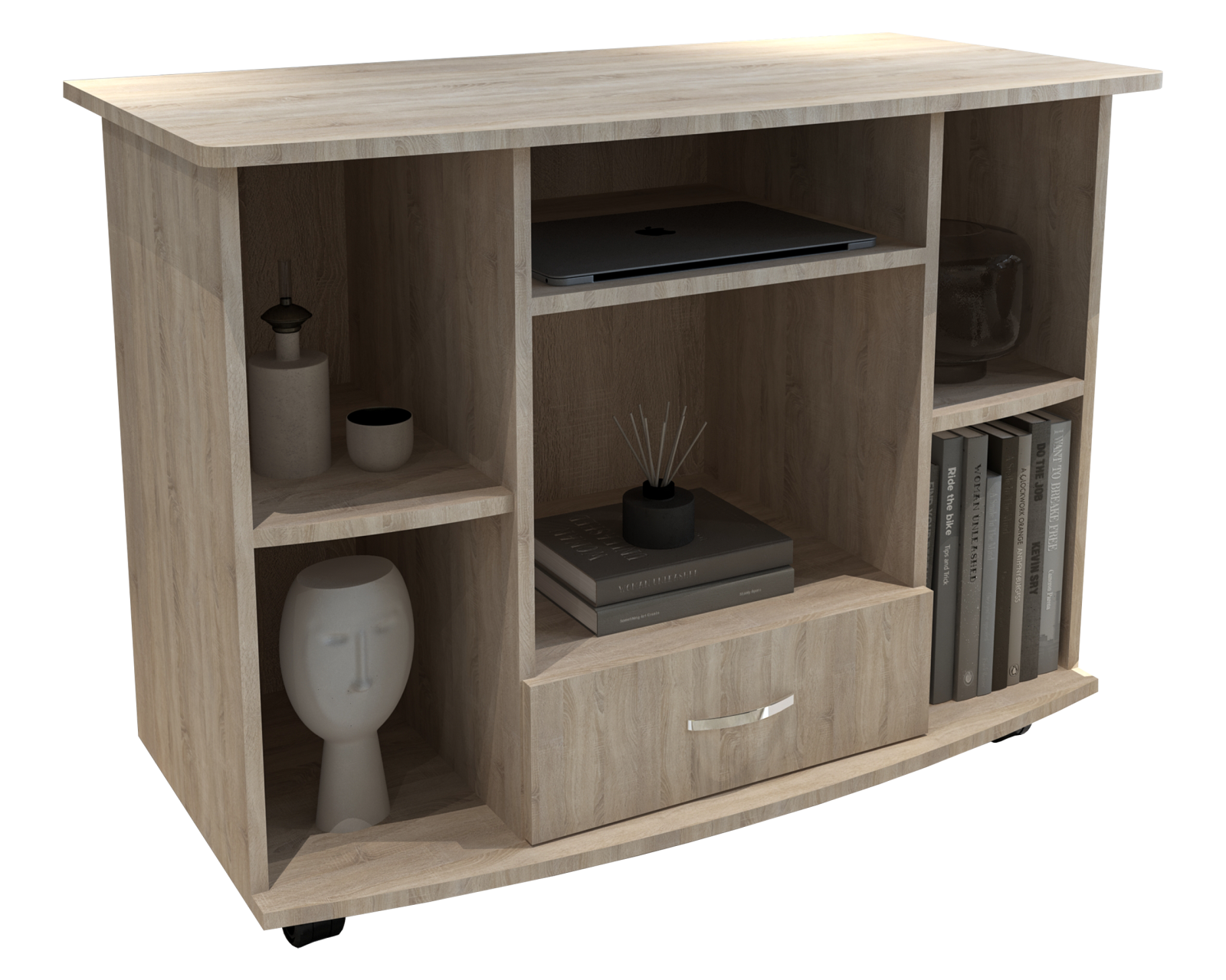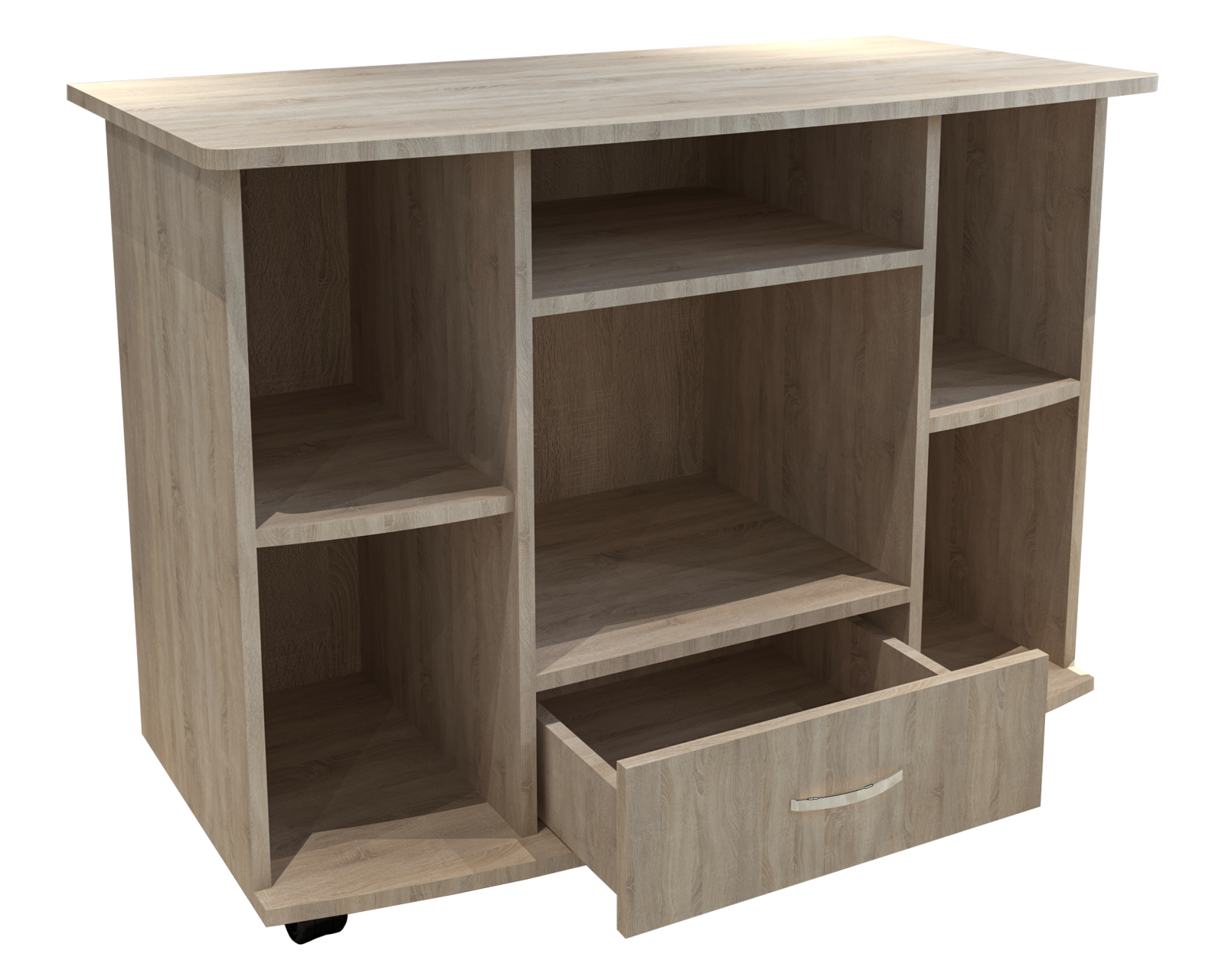 - Produsul este prevazut cu un sertar, 6 rafturi pentru depozitare, precum si rotile, in partea inferioara, ce permit o manevrare usoara.