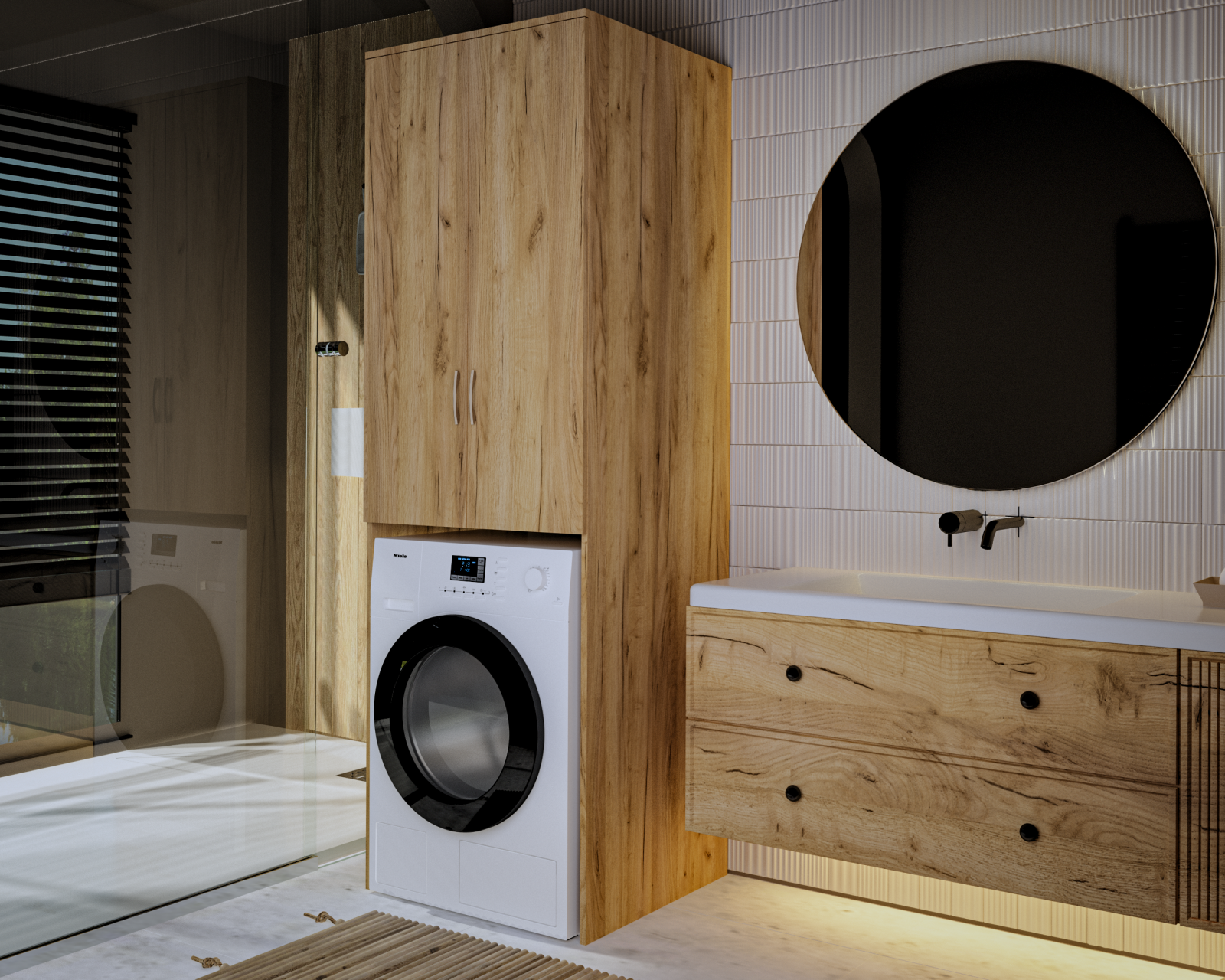 Pentru un aspect coerent cu finisajul Stejar K003, alege pereți în tonuri calde (crem, greige) și accente metalice negre mate ori inox periat. O oglindă baie mare și suprafețe în nuanțe deschise măresc vizual spațiul și aduc mai multă lumină în băile mici. Pe raftul deschis, folosește coșuri din fibre naturale pentru detergenți și o tavă decorativă pentru obiecte mici (uleiuri, loțiuni), astfel încât zona să rămână ordonată și personală.