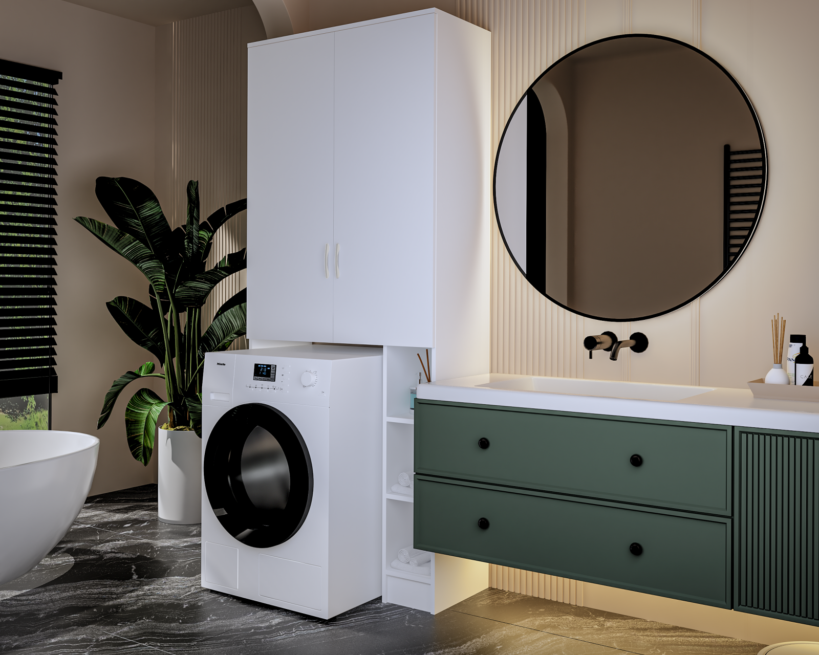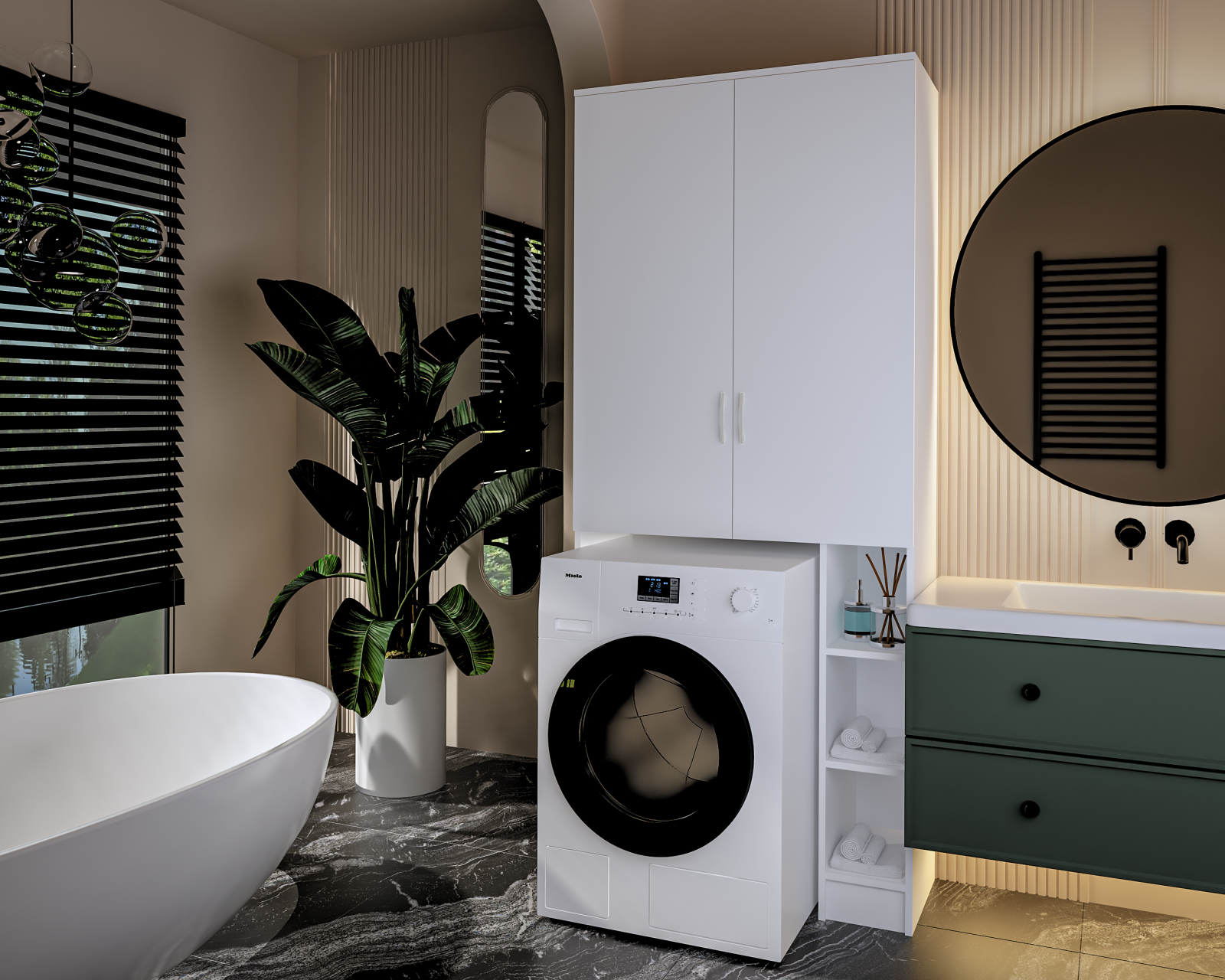 Este un adevărat dulap alb mașină de spălat care optimizează spațiul și menține baia aerisită și eficientă.