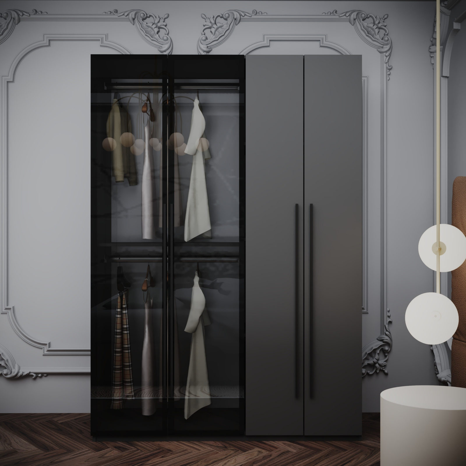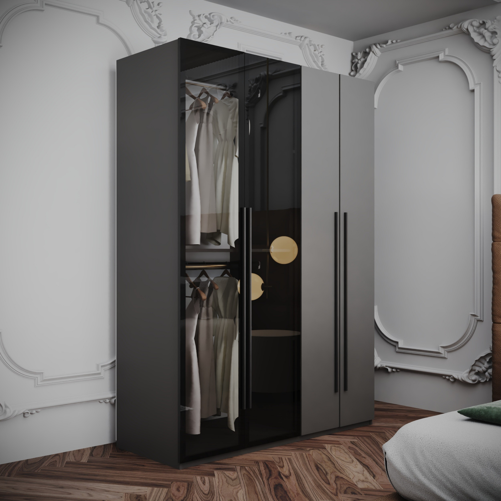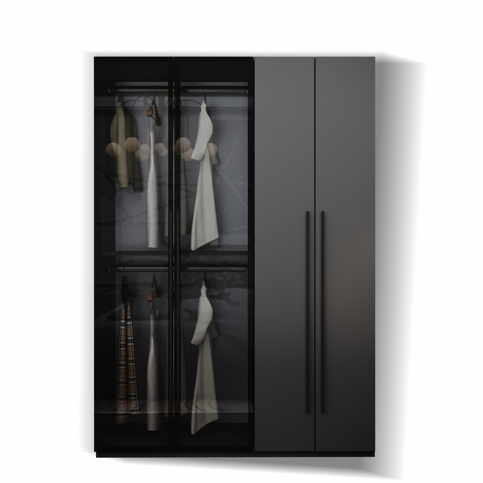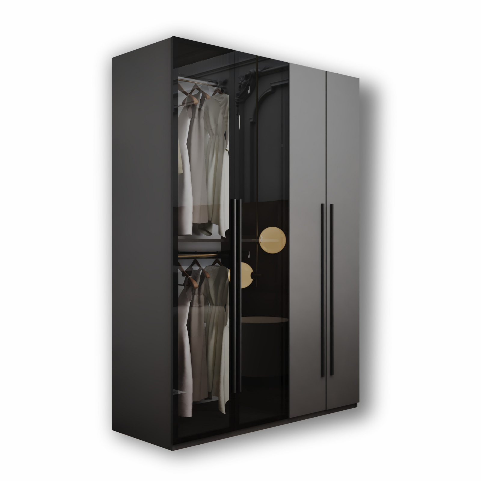 Acest dulap elegant, finisat într-un gri mat , se remarcă prin designul său modern. Dulapul dispune de patru uși: două dintre ele sunt gri, asigurând o notă de simplitate și eleganță, în timp ce celelalte două sunt din sticlă fumurie, oferind un aspect aerisit și permițând vizualizarea conținutului. Manerele de culoare neagra adaugă un accent minimalist completând aspectul piesei.