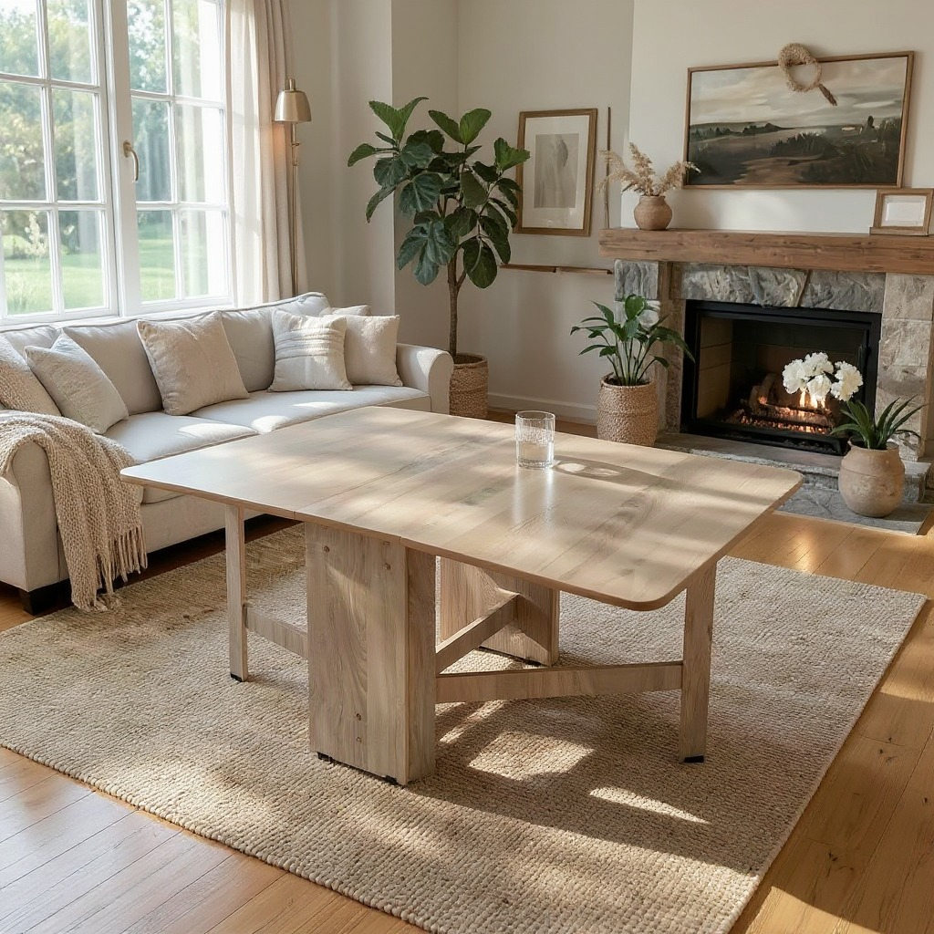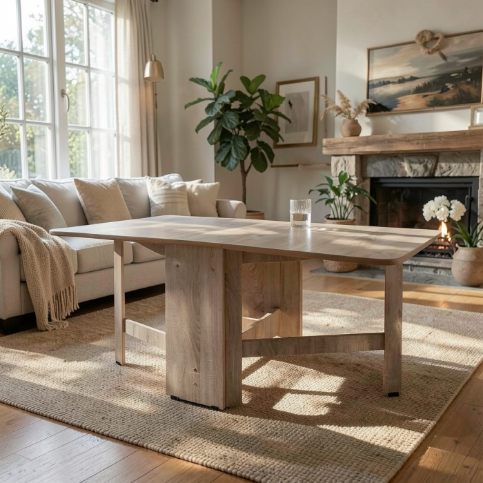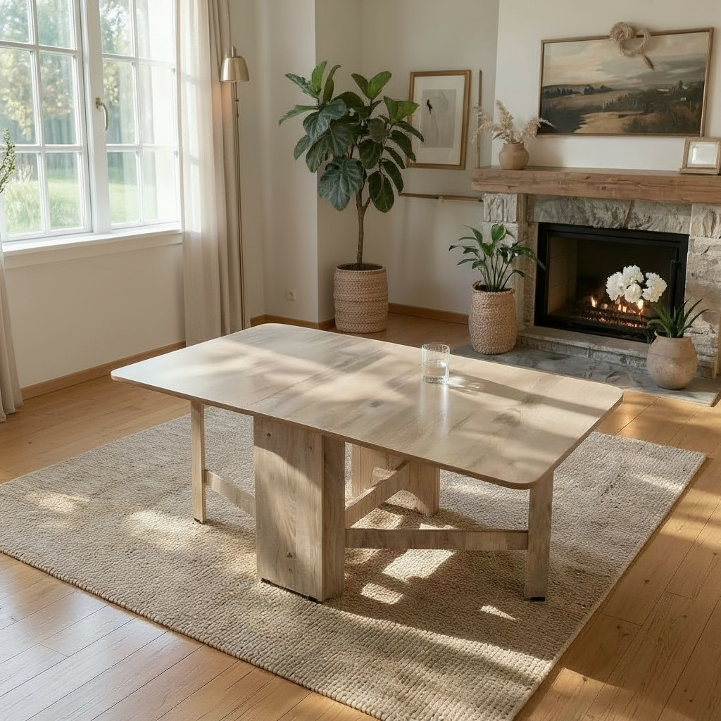 Este o masa plianta, realizata din PAL melaminat, ce permite reglarea dimensiunii, prin ridicarea uneia sau a ambelor parti, in functie de necesitate. Cele 2 parti laterale sunt sustinute de un cadru de PAL, ce se roteste cu usurinta datorita balamalelor cu care este prins.