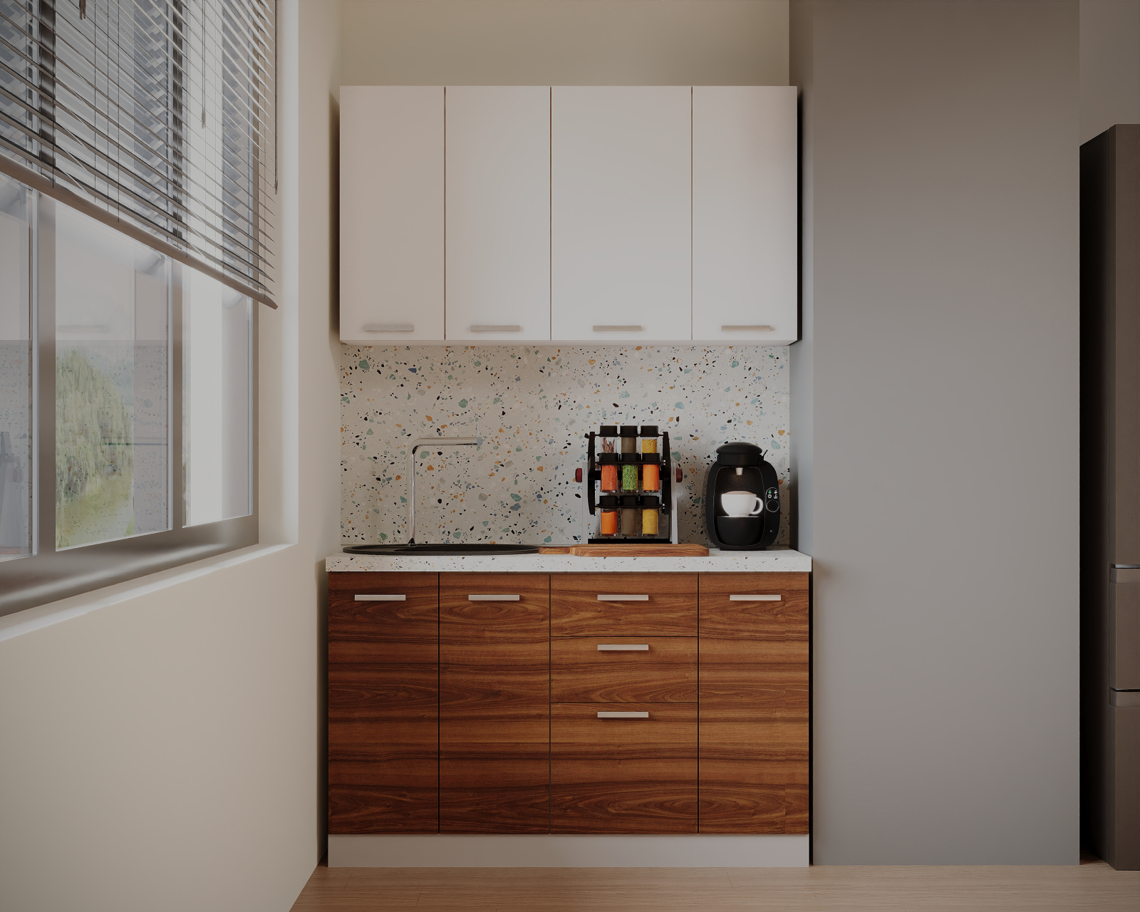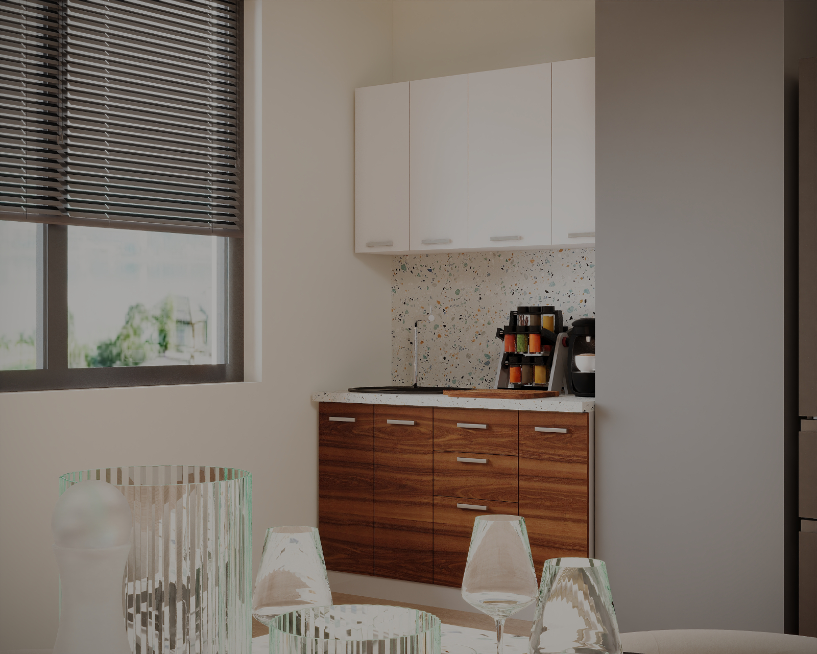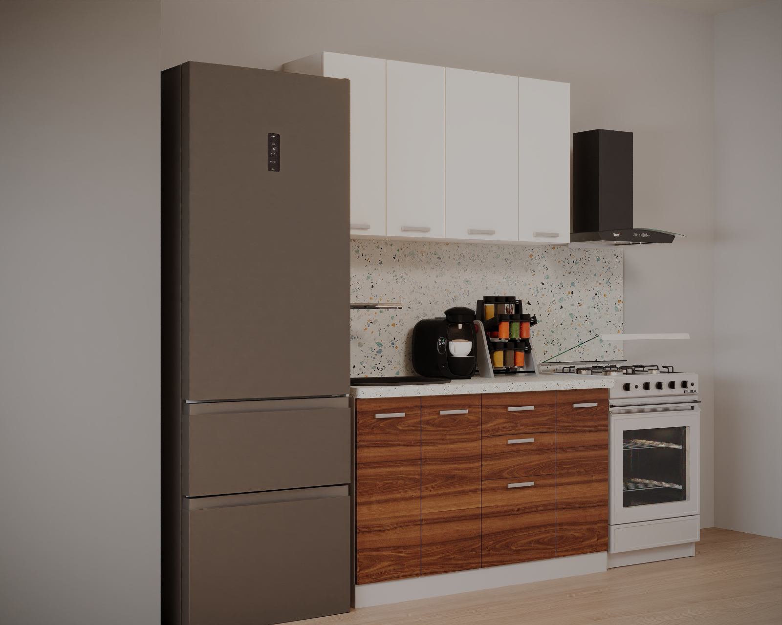 - Partea inferioara este formata dintr-un corp de 30cm cu 1 usa, o masca de 60cm, un corp de 40cm cu 3 sertare si blat termorezistent ( blat pentru fiecare corp in parte ) mai putin la corpul masca de chiuveta. Partea superioara este formata dintr-un corp de 60cm, 1 corp de 40cm si 1 corp de 30cm.
