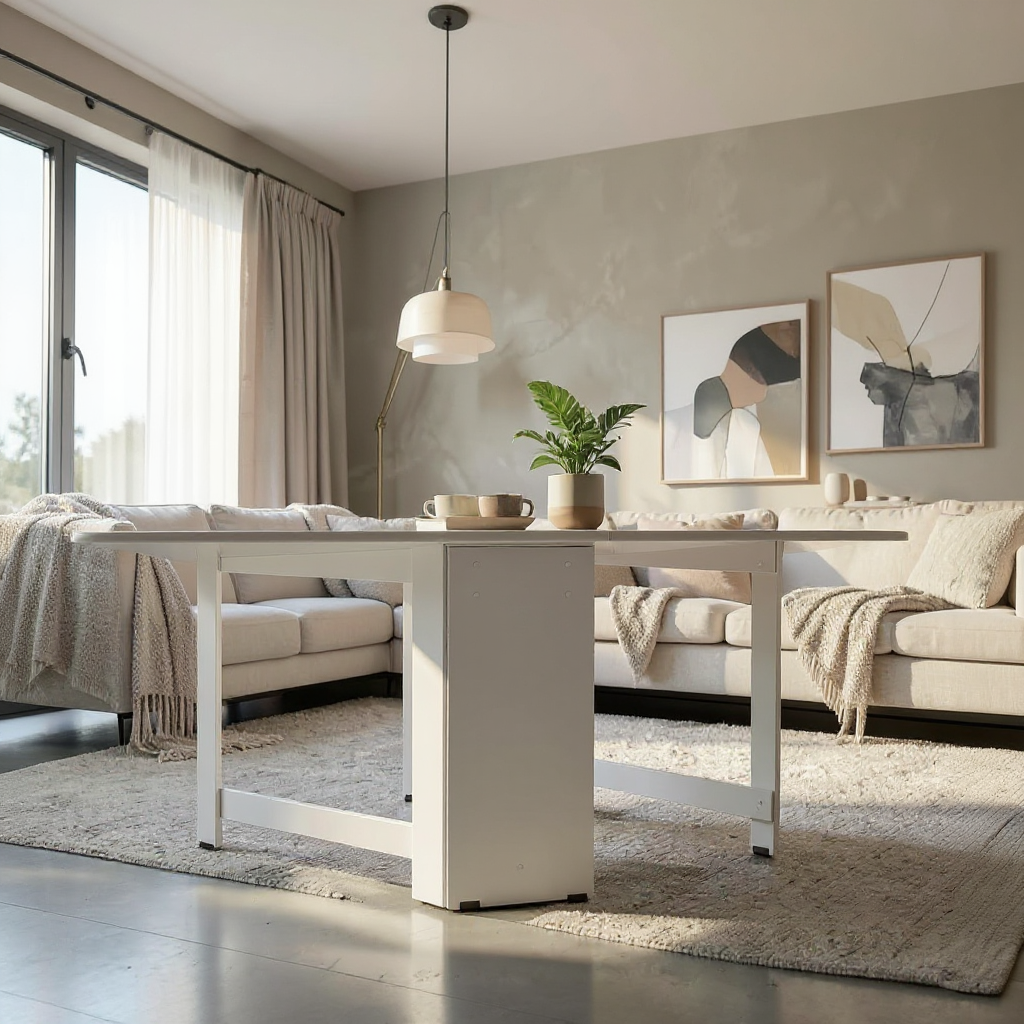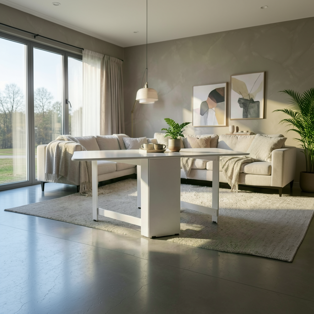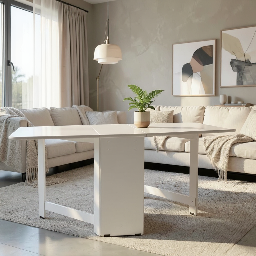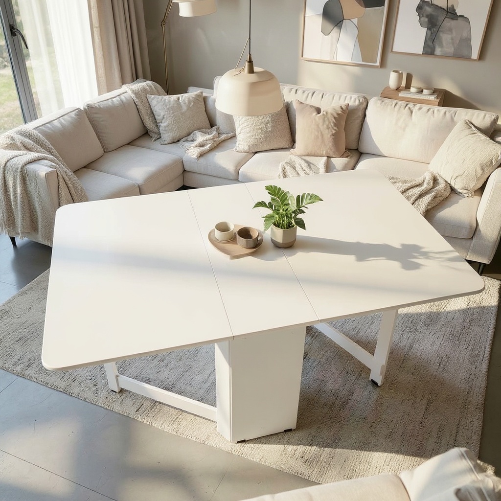 Este o masa plianta, realizata din PAL melaminat, ce permite reglarea dimensiunii, prin ridicarea uneia sau a ambelor parti, in functie de necesitate. Cele 2 parti laterale sunt sustinute de un cadru de PAL, ce se roteste cu usurinta datorita balamalelor cu care este prins.
