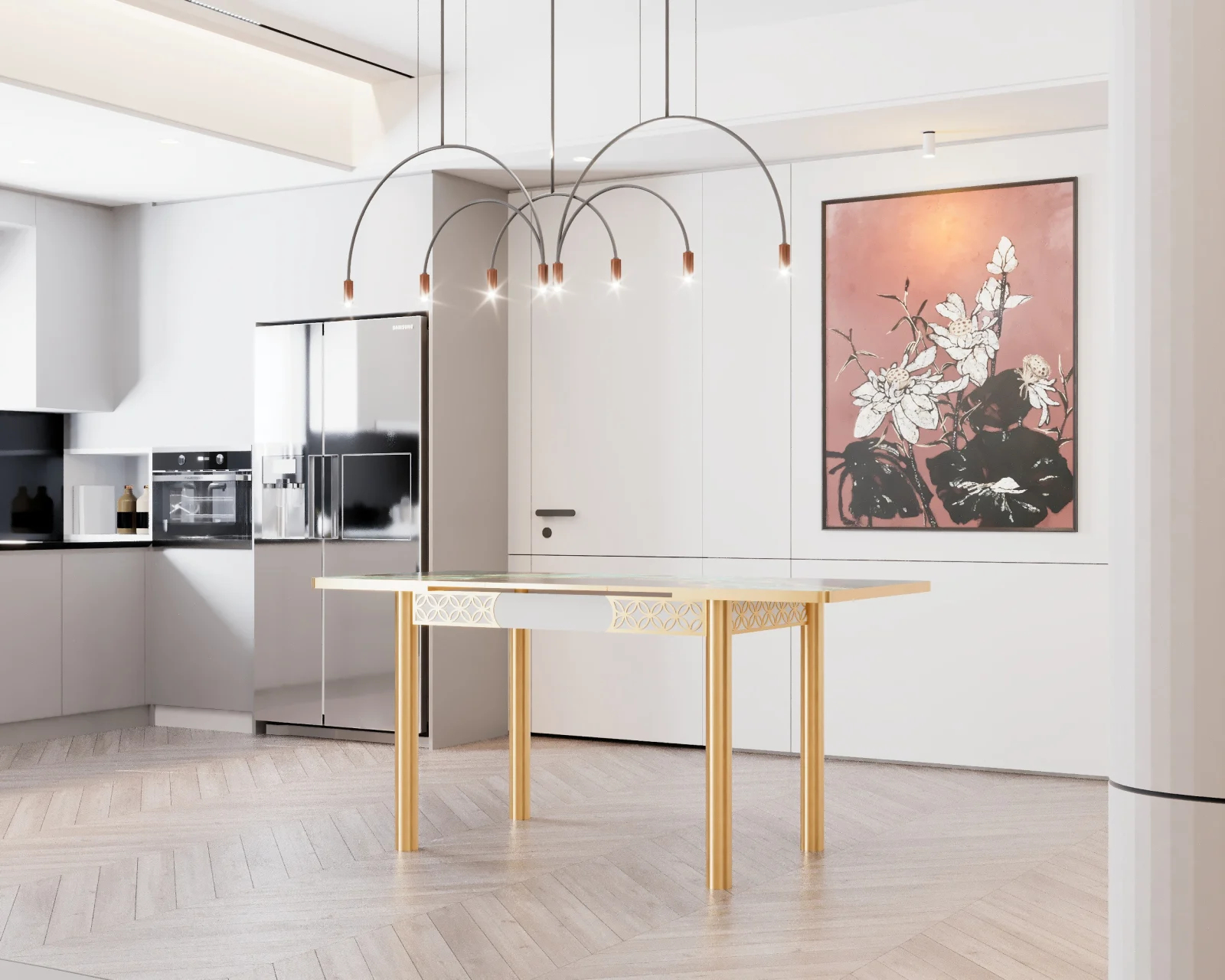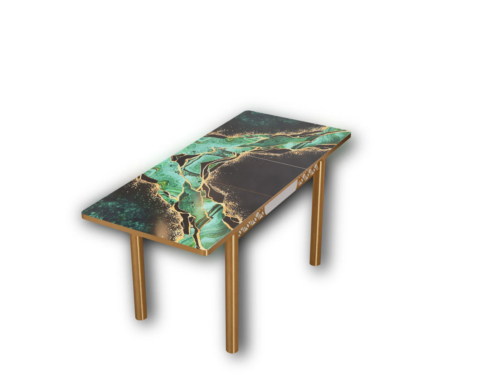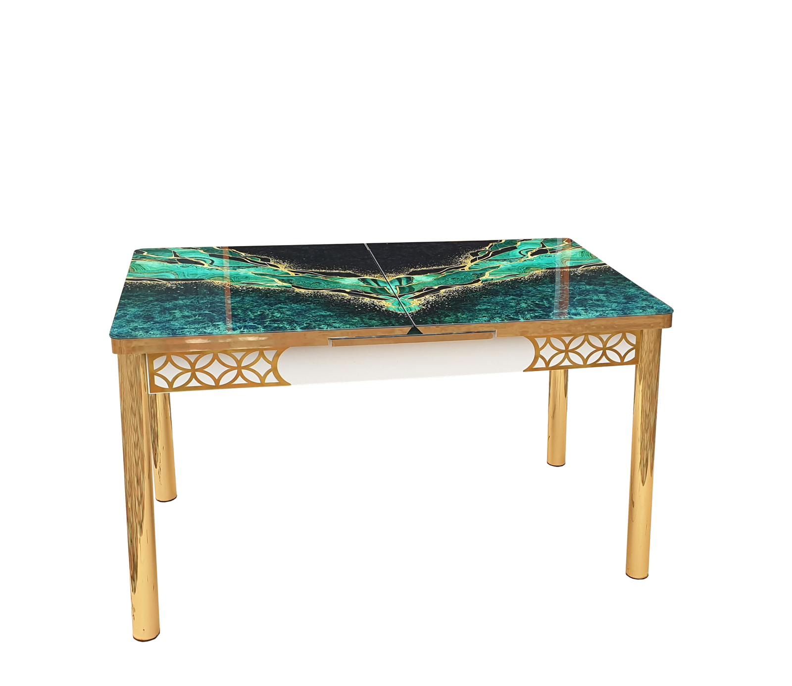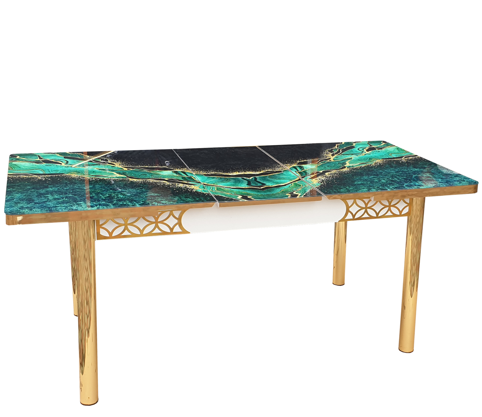 Adaugă un plus de rafinament diningului tău cu acest set de masă cu 4 scaune modern, ideal pentru living sau dining, cu un design elegant și rafinat. Masa are blat din sticlă securizată, decorat în nuanțe de verde smarald și auriu, iar picioarele metalice aurii oferă stabilitate și un aspect luxos. Scaunele sunt tapițate în catifea verde, asigurând confort și un plus de stil. Setul este perfect pentru amenajări moderne, aducând o notă de exclusivitate oricărui spațiu.