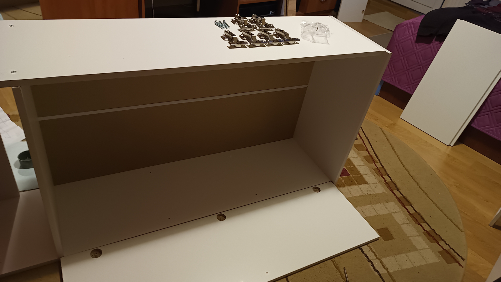 În principiu este OK, doar două mici probleme. Blatul de jos are găurile de prindere in laterale decalate cu aprox 2 min și 2 balamale din cele 6 sunt diferite, nu îmi dau seama cum să le pun. Mi-au rămas și 4 șuruburi, nu am idee de ce.
