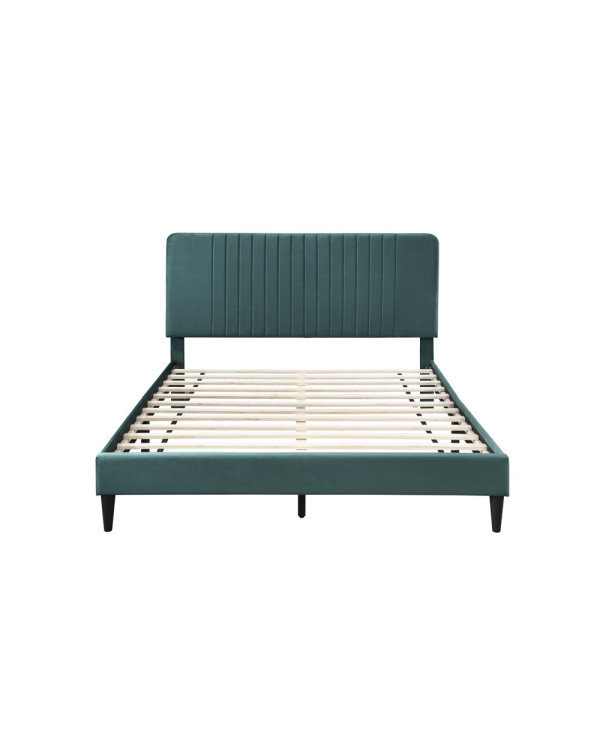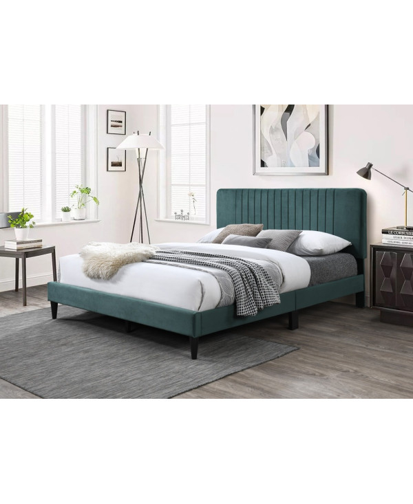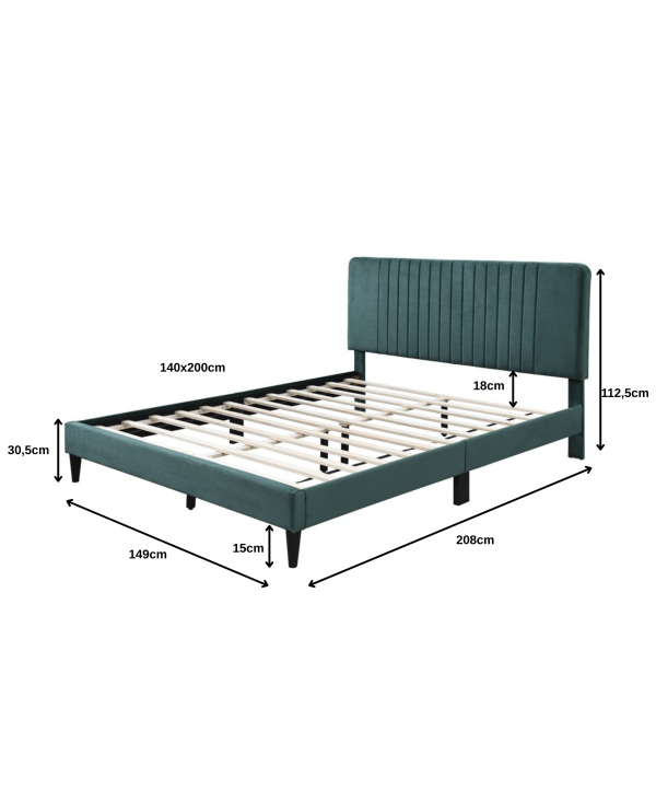 Pat tapitat Emerald cu catifea verde, 140x200, cadru din lemn cu somiera fixa
